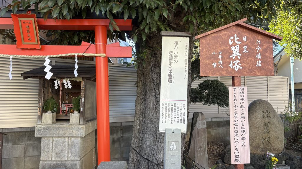 比翼塚の隣には茶屋があります。目黒不動尊はサツマイモを広めた青木昆陽と繋がりがあるためか焼き芋を販売しています。