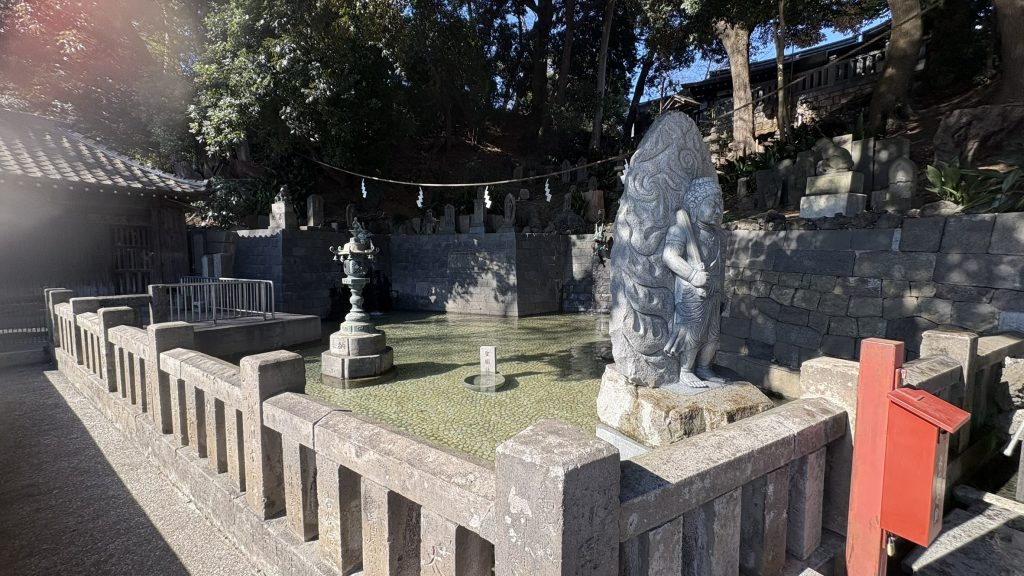 境内にある小さな滝。水の音が心を落ち着かせてくれます。浮世絵などにある滝よりはだいぶ小さく見えます。昔は大きかったのか、それとも誇張して大きく描いたのか分かりませんが、私は目黒不動尊のなかで霊的な力をここで一番強く感じました。手前の不動明王像に水を3回かけると御利益があるとのことです。